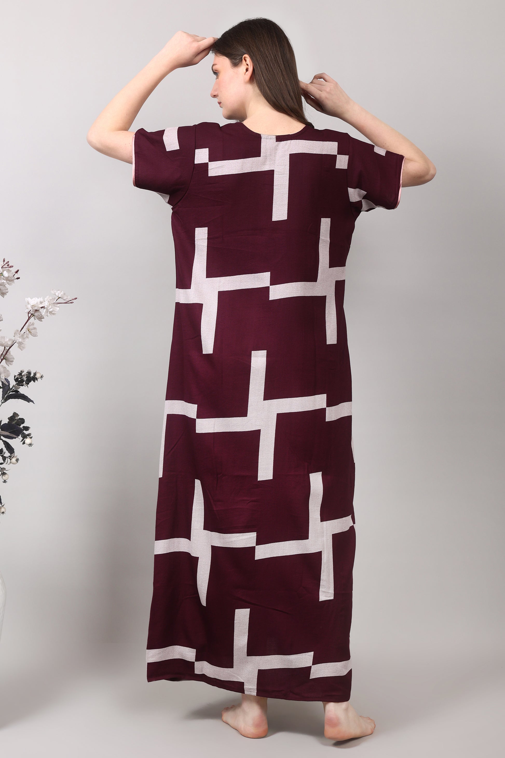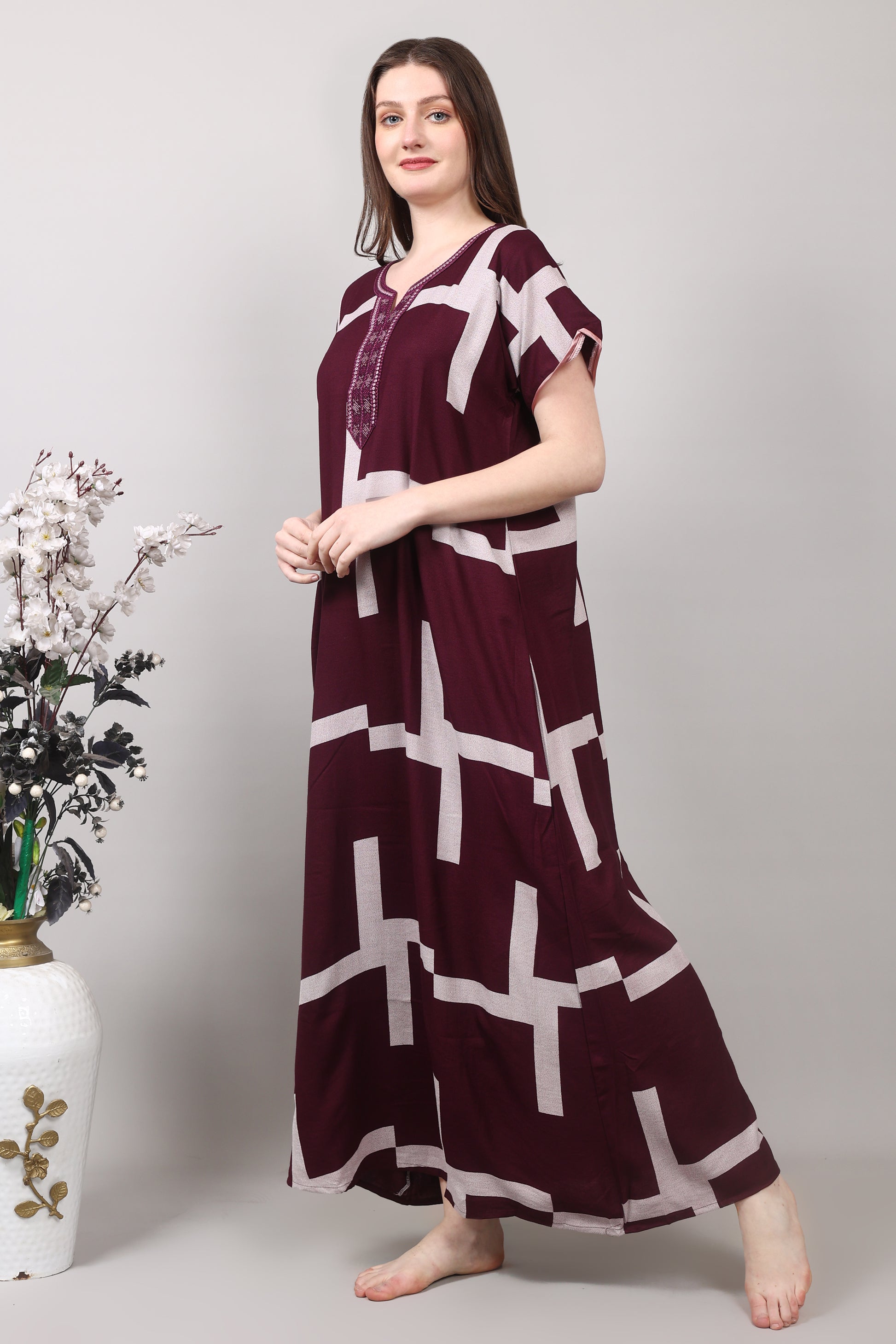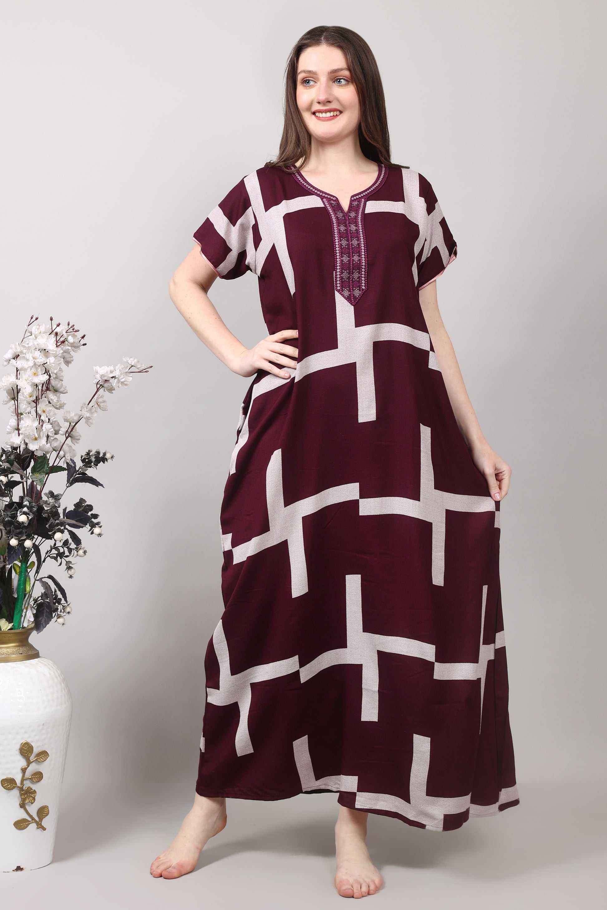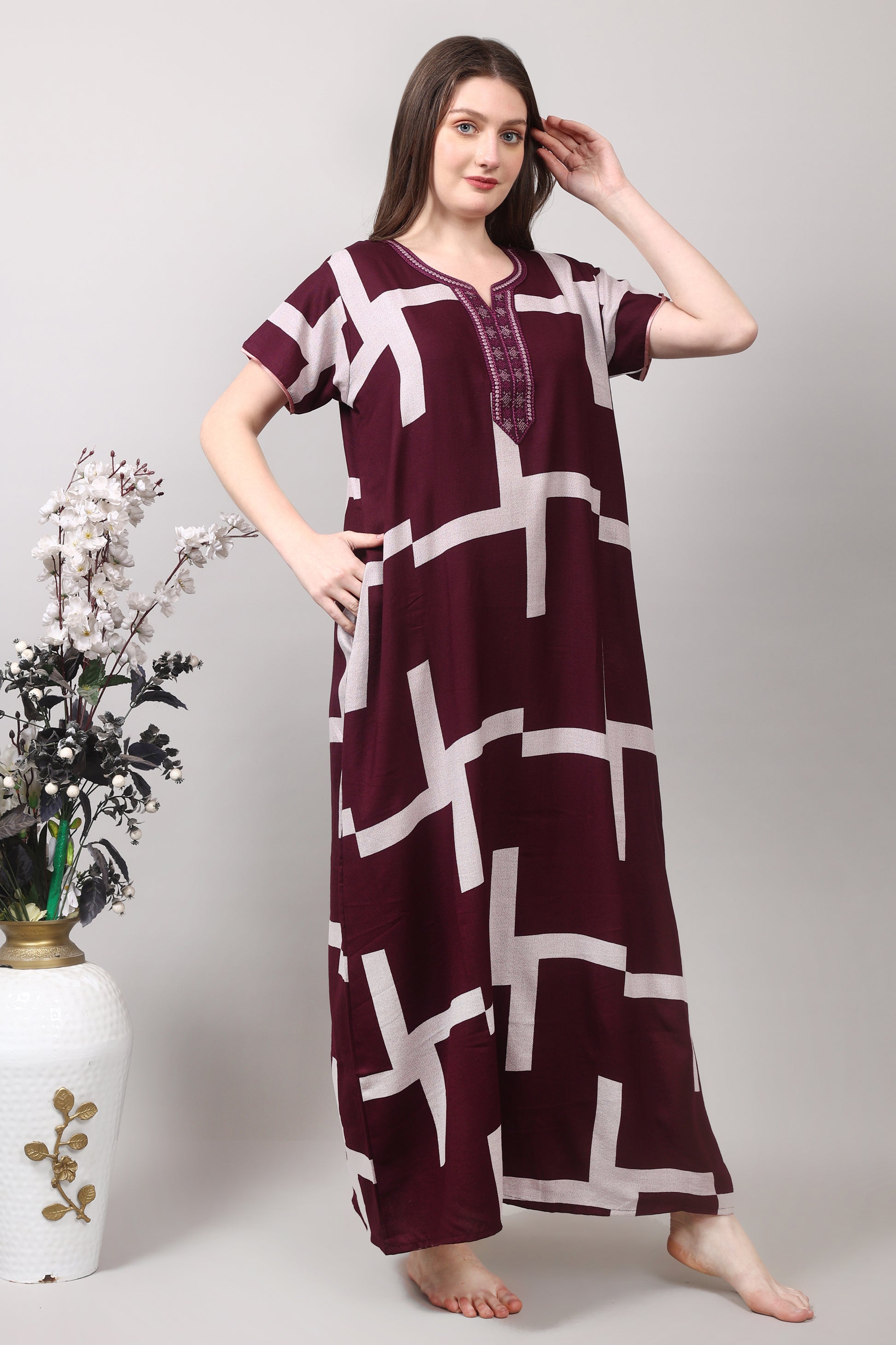 Girls And Moms Women’s Nightgown | Wine Color with Abstract Geometric Print | Embroidered Neck Sleepwear | Premium Lounge Gown