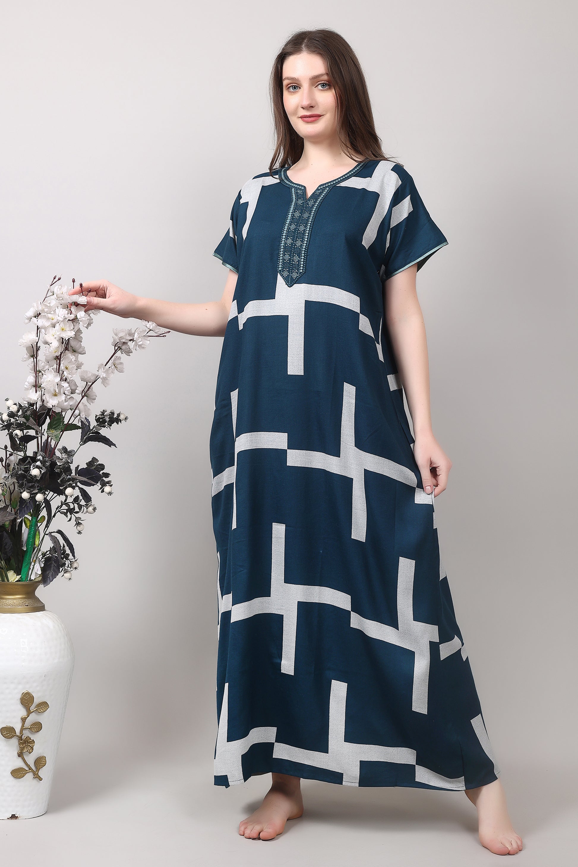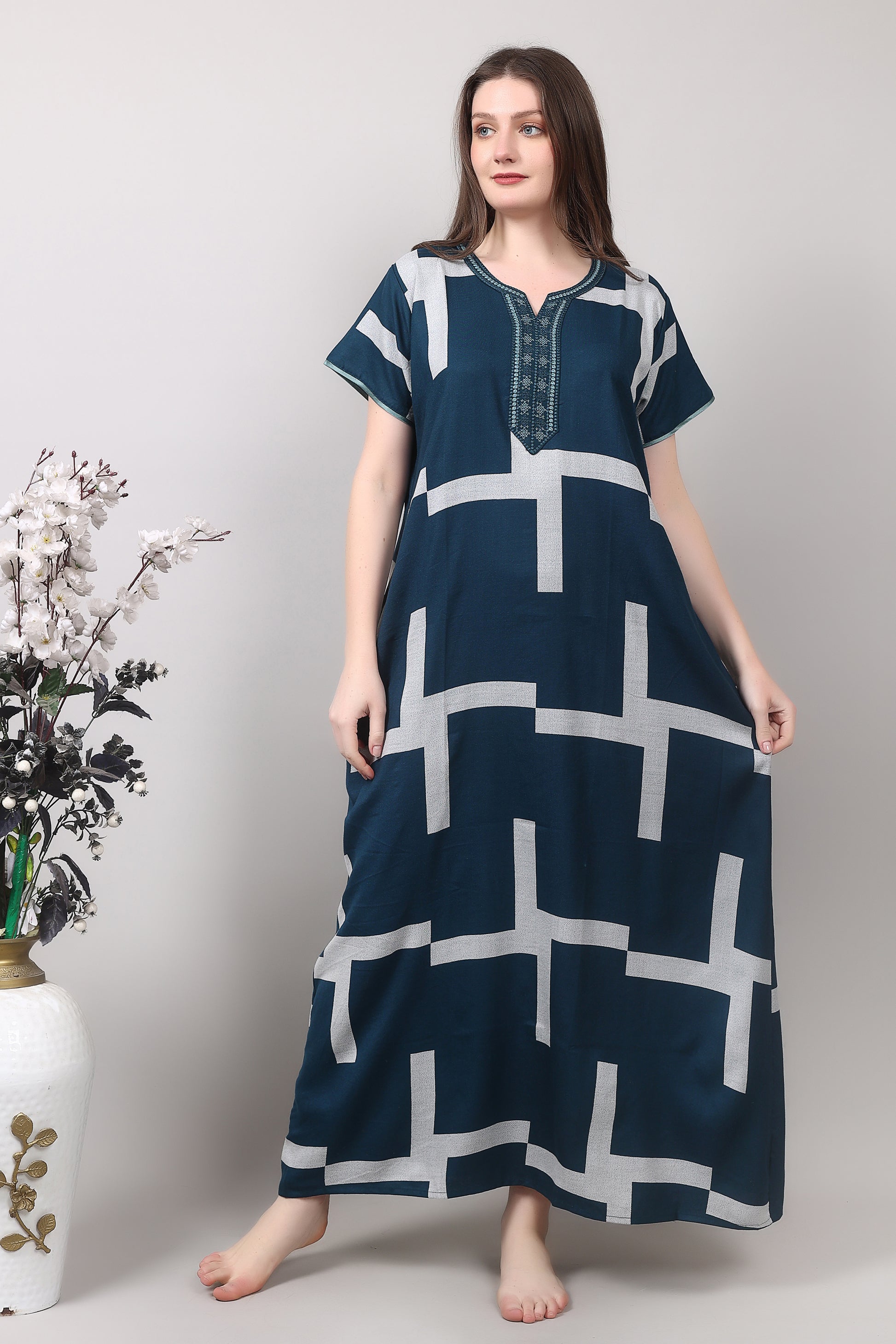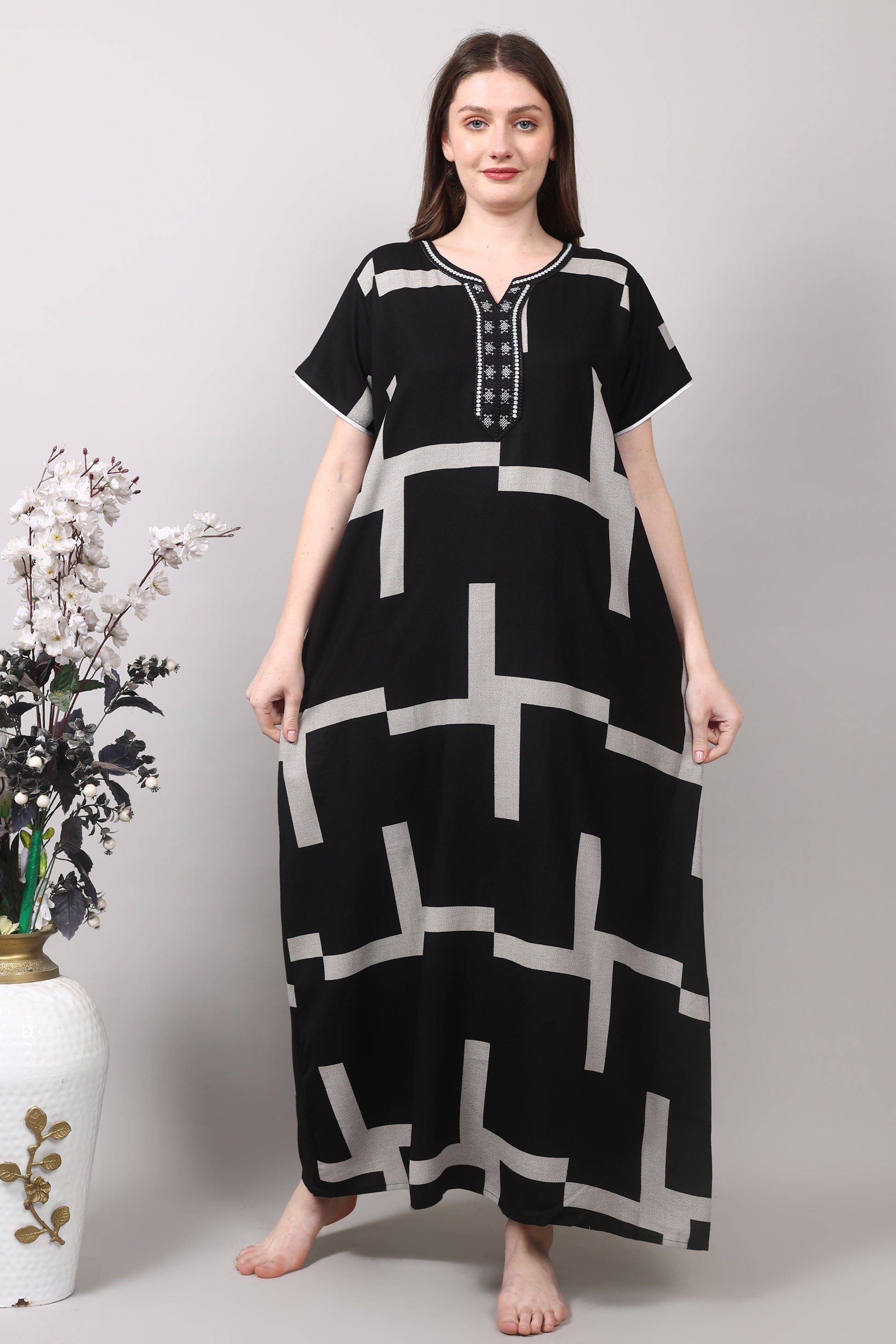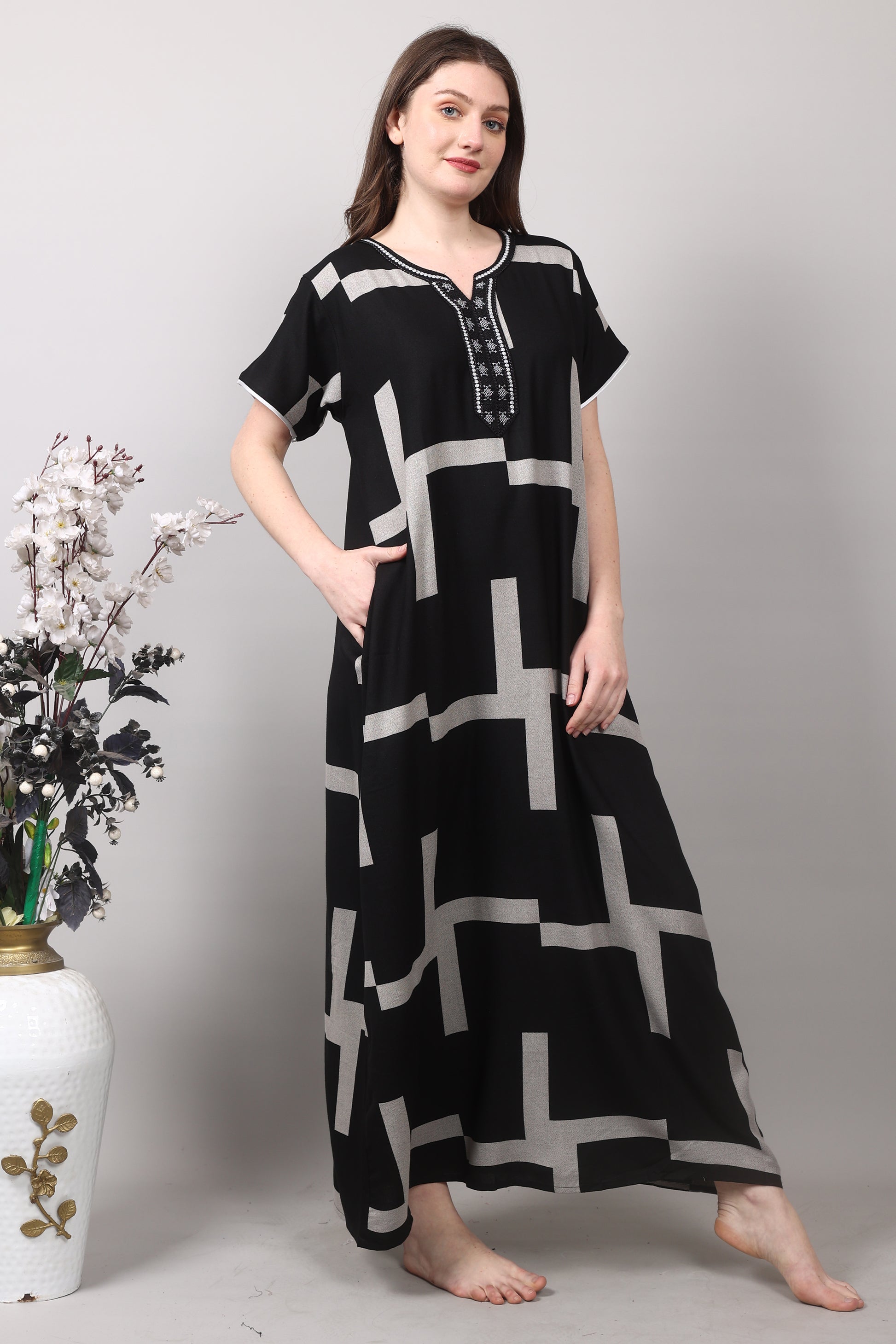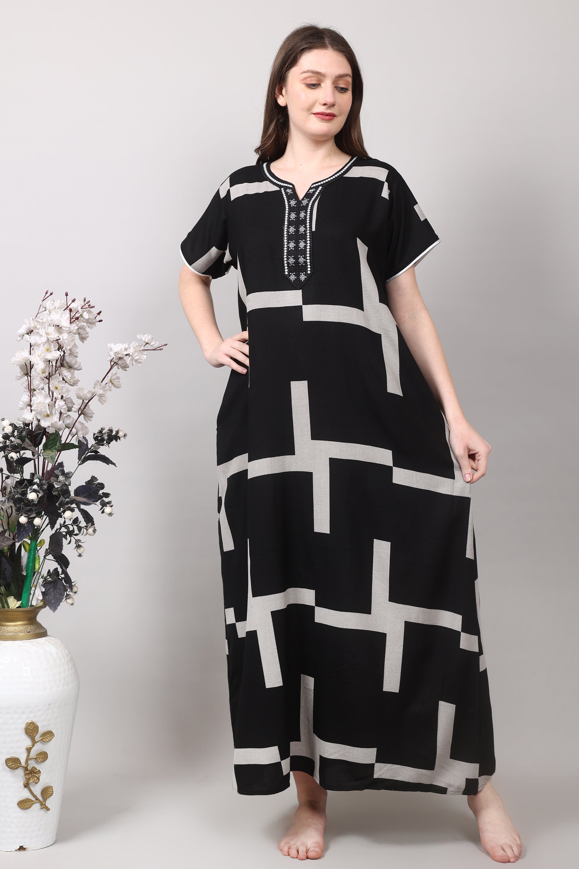 Girls And Moms Women’s Nightgown | Wine Color with Abstract Geometric Print | Embroidered Neck Sleepwear | Premium Lounge Gown